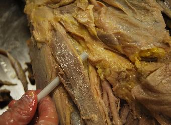The Saphenous Nerve can be seen high in the thigh adjacent to the Femoral Artery. It becomes more difficult to see as you go further caudally, especially once the Femoral Artery dives deep. At this point, the Saphenous Nerve follows the Descending Geniculate Artery. In fact, the Descending Geniculate Artery can become difficult to find.
