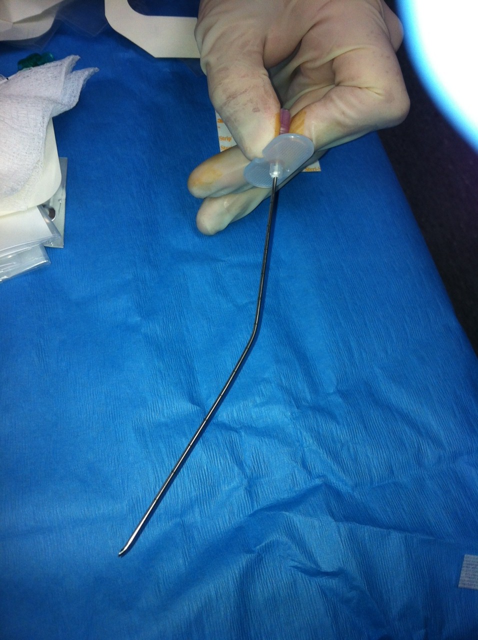 The second trick is to bend the needle (see below). I utilize this trick more often when there is significant adipose tissue over the abdomen. When you have to descend through several centimeters of adipose just to get to the rectus muscle, the angle of your needle is more steep of course. As you drive the needle onward, you end up driving it more toward the peritoneum, so angling the needle allows you to ‘make the curve’ much easier. It is fine if this eventually causes your needle to aim in a superficial direction. If this becomes a problem (apart from starting over after decreasing the angle of the bend), you can rotate the needle in a slight medial or lateral direction to minimize the angle. Let me state that bending the needle adds an additional dimension to keeping the needle in-plane with the ultrasound probe.